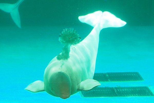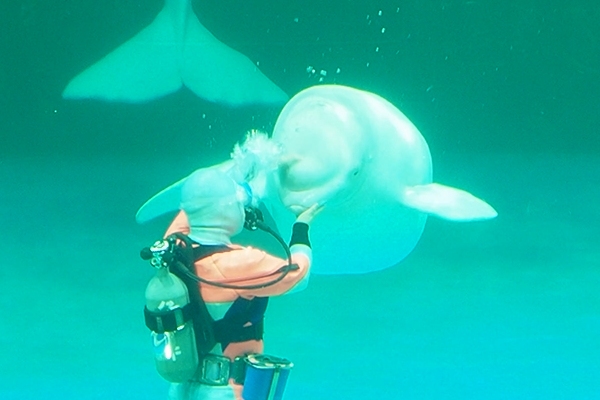 ダイバーさんが、ベルーガの頭をポヨンポヨンしたり