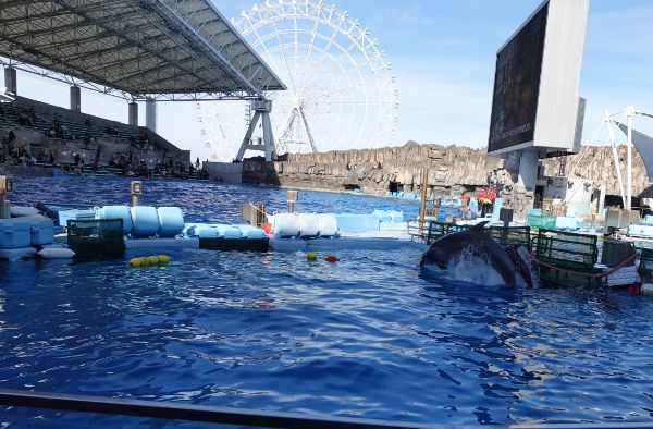 また、メインプールのすぐ脇にあるサブプールでは、目の前でショーに出ていないイルカを見る事ができました。背景には観覧車も見えてとても良い眺めです!