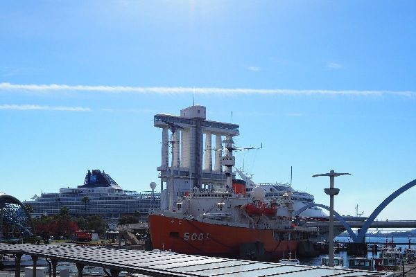 目の前の港には「南極観測船ふじ」や白い帆船をイメージしたとても変わった形の「名古屋港ポートビル」、寄港中のノルウェーのクルーズ船も見えました。