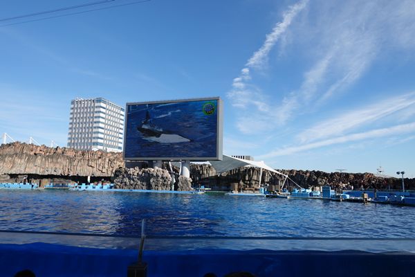 スタジアムで観覧することもできました。ただし、スタジアムの観客席の目の前のプールはイルカ専用らしく、シャチのトレーニングは大画面の裏側の水槽で行われているため、観客席からは殆んど見えません。観客席で観覧する場合には大画面で楽しむ感じになります。