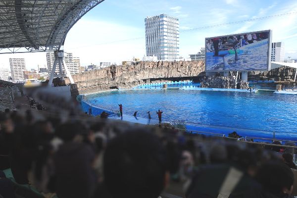 名古屋港水族館はイルカの水槽がとても広いです。とりわけその広さに驚いたのは、ショーを行う屋外プールです!観客席も広いので座れないという心配をあまりしなくても良いのが有難い。