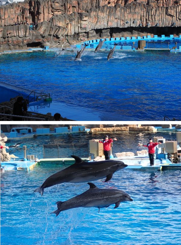 イルカショーの間は遠くからでもイルカがよく見えるように、正面の大画面にライブ映像が映し出されます!